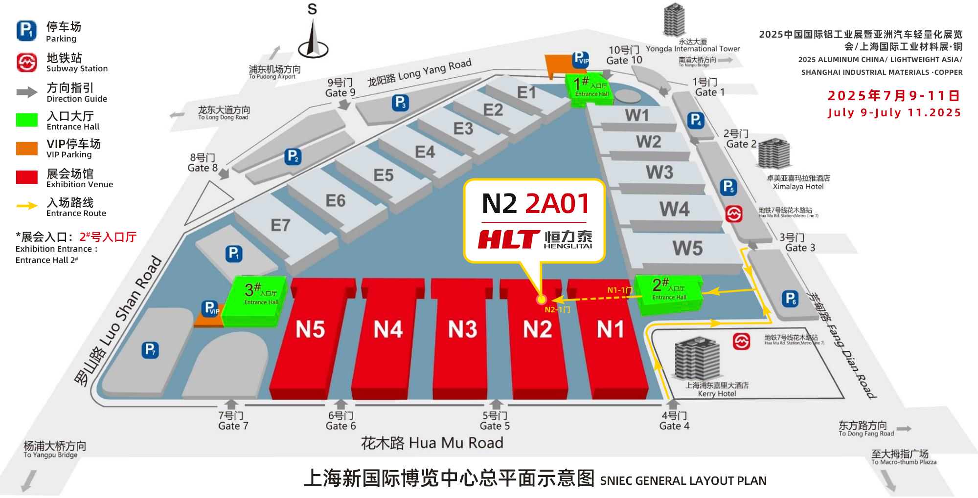 从2号入口厅(芳甸路1210号与花木路交叉口)领证入场后,按上图所示红色箭头行走,通过N1馆①号门一路直行,通过N2馆①号门,入门右侧即恒力泰机械展位2A01。